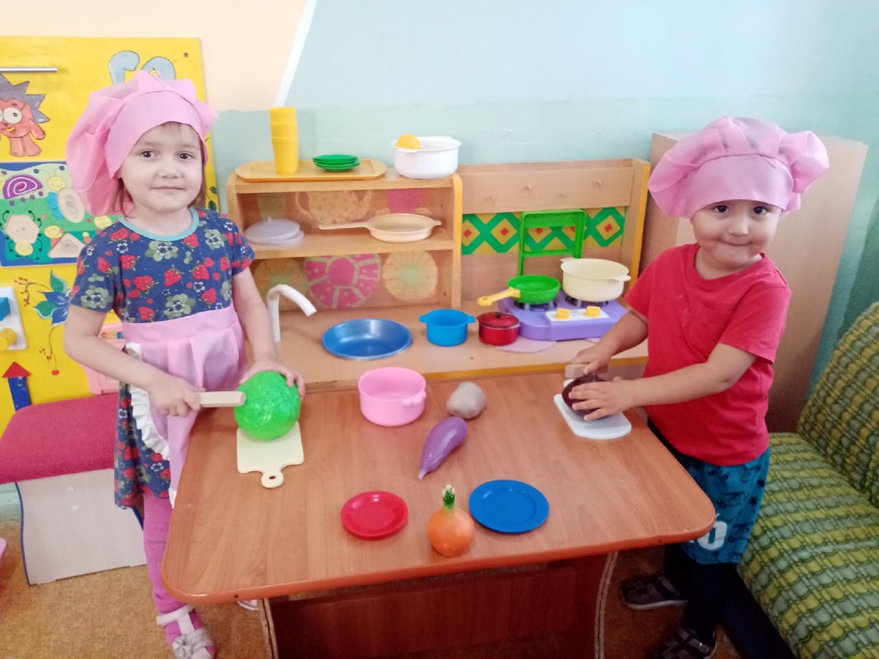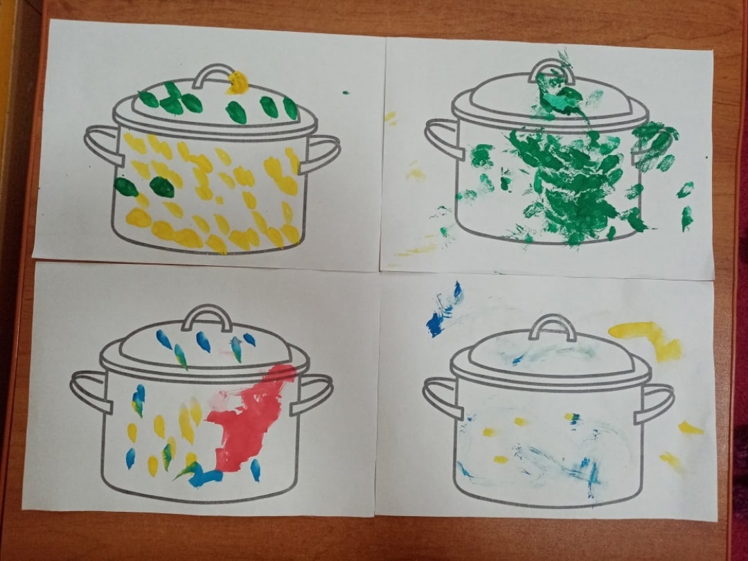 Сегодня с детьми провели беседу о поварах, играли дидактические и настольные игры "Что лишнее?", "Чудесный мешочек", "Профессии" итд. Рассмотрели и расскрашивали иллюстрации с изображением поваров и других профессий, украшали посуду. Дети попробовали себя в роли поваров: вместе приготовили суп.