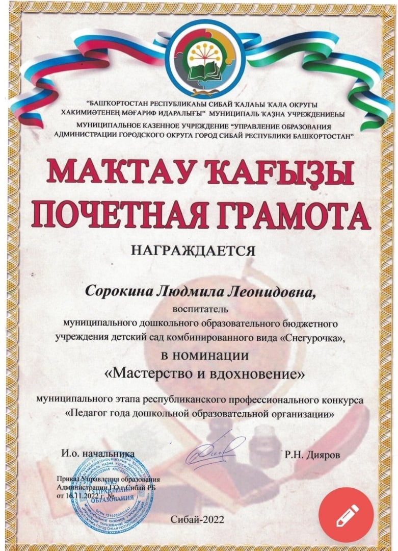 Сорокина Людмила Леонидовна, воспитатель МДОБУ д/ с "Снегурочка", приняла участие в муниципальном этапе республиканского конкурса " Педагог года дошкольной образовательной организации РБ - 2022". Людмила Леонидовна награждена Почетной грамотой в номинации " Мастерство и вдохновение". Поздравляем! Желаем педагогического творчества и удачи!