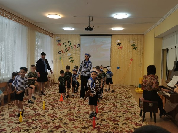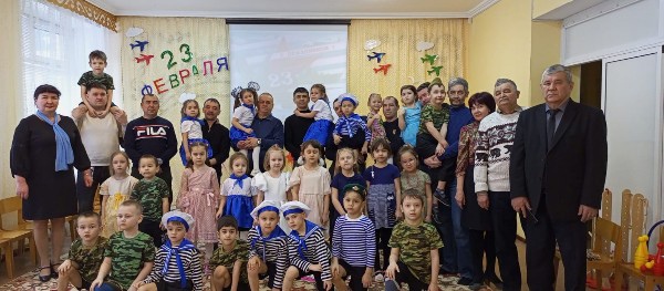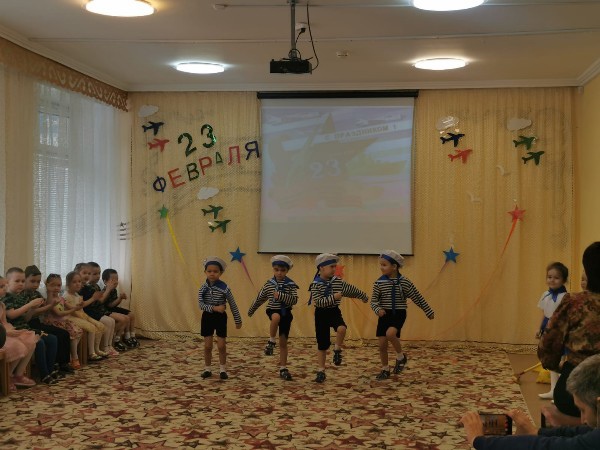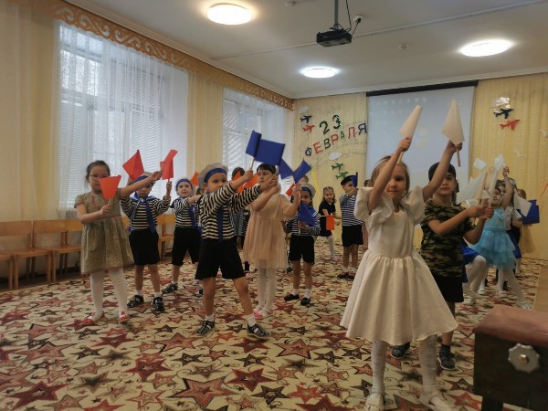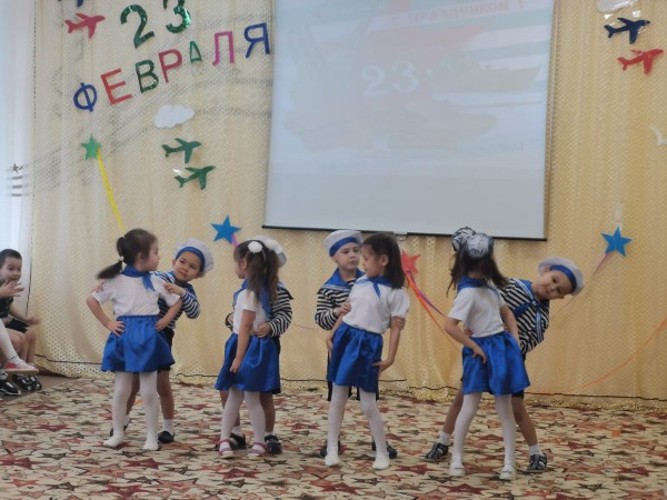 На праздник пришли папы и дедушки. Под марш дети торжественно вошли в зал, поздравили своих близких и исполнили танец с флажками. Папы и дедушки с гордостью смотрели на своих детей, которые от души поздравляли, читали стихи, пели песни, танцевали.